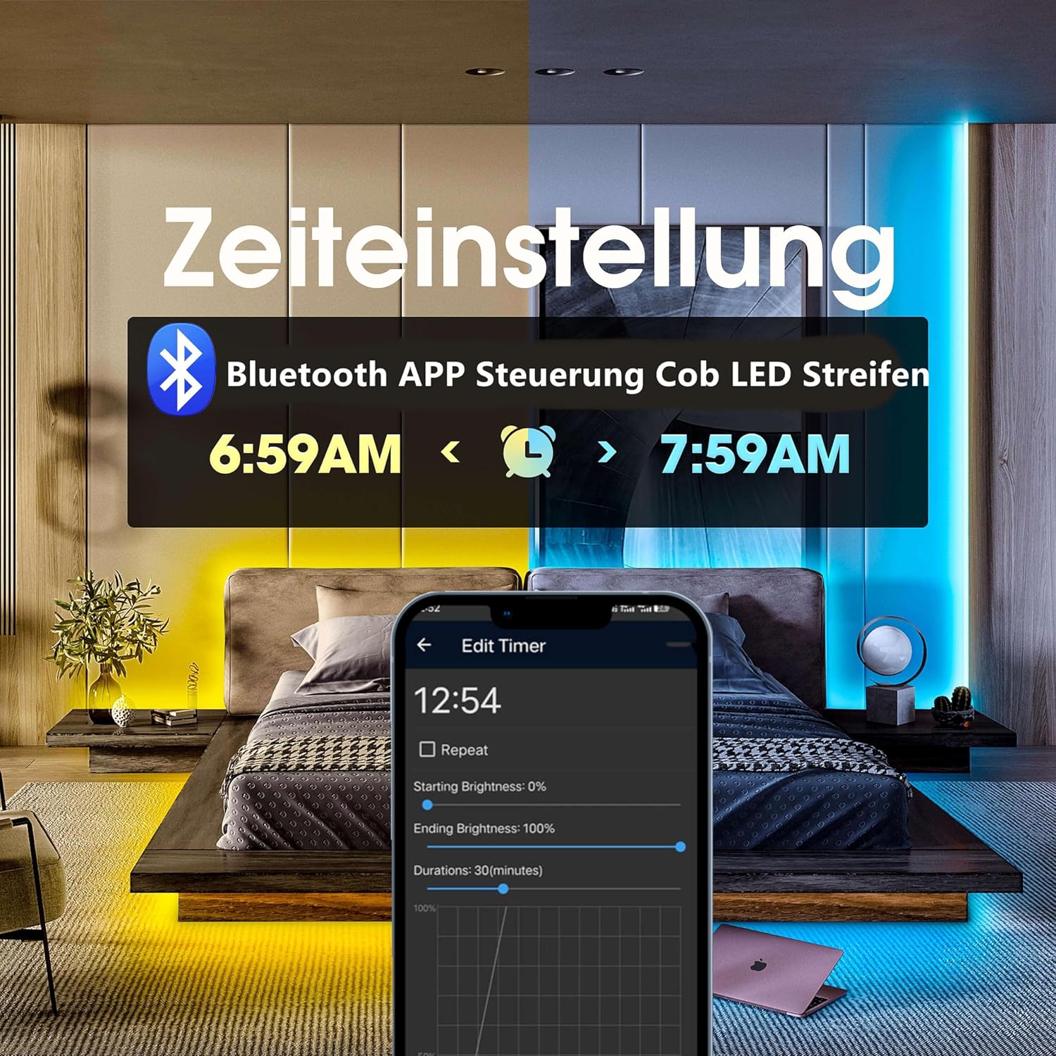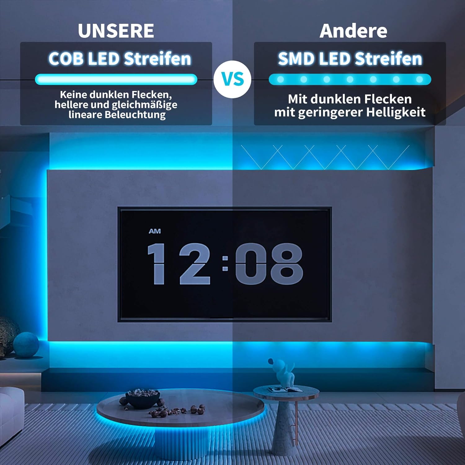 【Dual Control Mode】This LED COB strip light kit supports IR remote control and Bluetooth APP control. No WiFi or ZigBee hub required. You can easily set color, brightness, timed on/off, and synchronize music. You can also set up groups and synchronize control