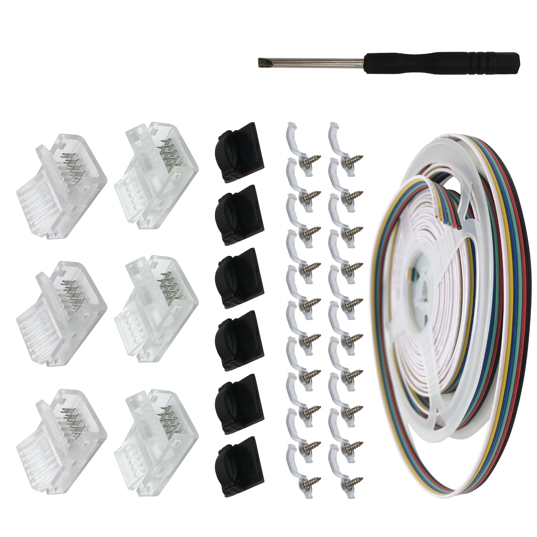 【LED Lights DIY Accessories 34pcs Kit】The kit includes 6 LED connectors, 5m cable,6 card wire buckles,1 mini screwdriver and 20 LED Light Strip Mounting Brackets. Meet your accessory needs when installing rgbww light strips.