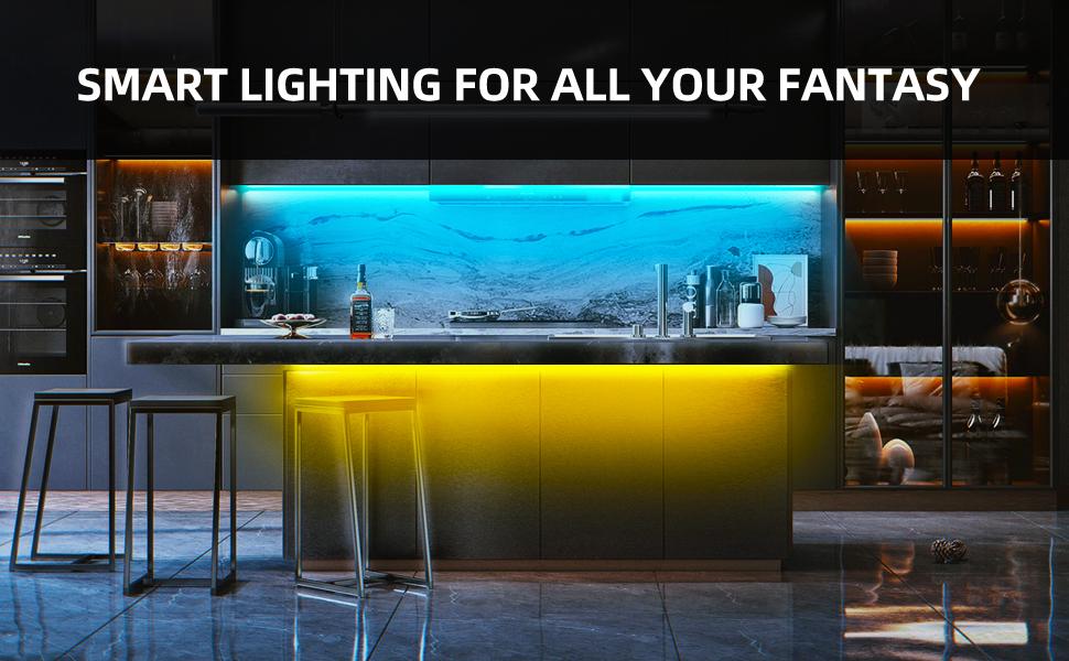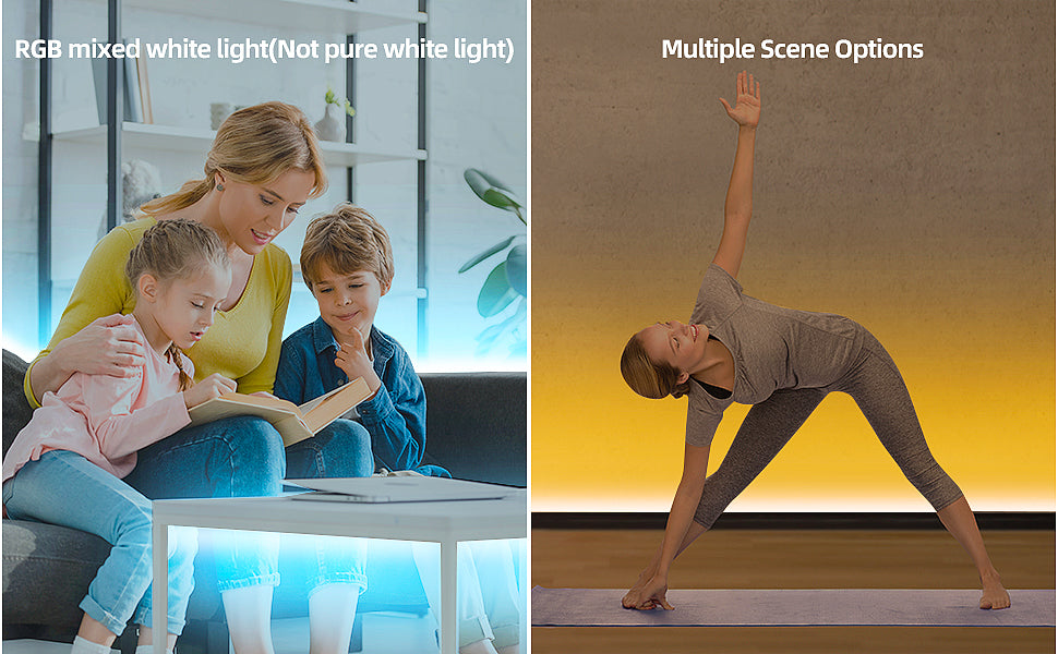 - Smart APP Control lighting from anywhere:Install the APP.Even if you are not at home,you can use mobile phones for smart lighting control.Or set a schedule save your time,turn on the light before you get home.【NOTE:This RGB light strip Kit has no pure white light,but a white light mixed with R.G.B.】