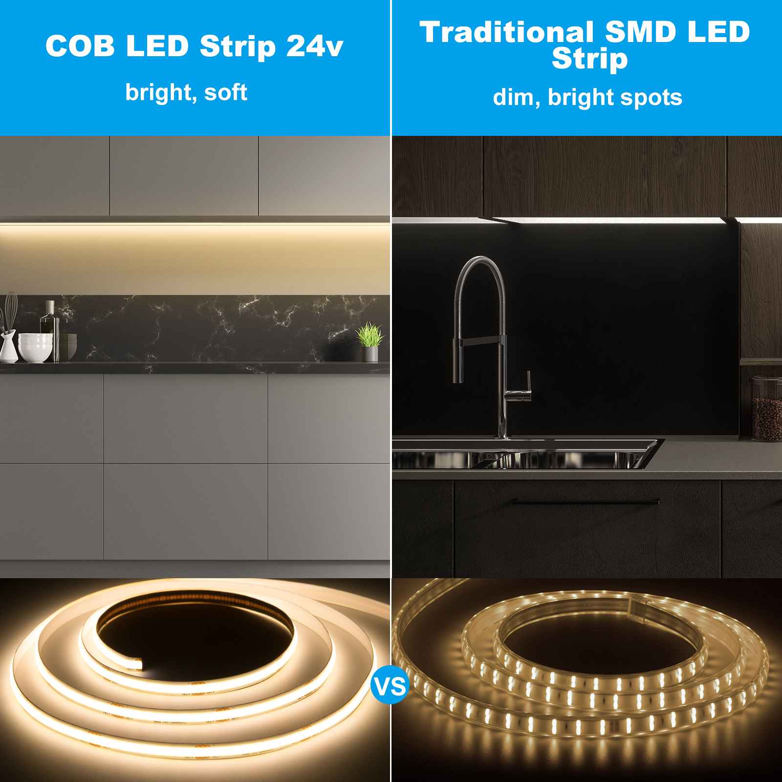 - High Density: COB LED light strips with 2928 LEDs(480 LEDs/m),