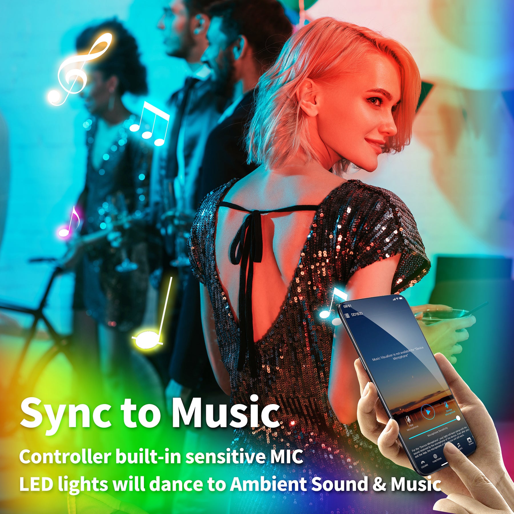 【Sync to Music】Built-in high sensitive mic. It can activate the RGB lightstrip via musicin the smart phone. And you also don't need to open the phone APP, select the music mode on the remote control, LED lights will dance to music & ambient sound. Perfect for party or holidays like Christmas